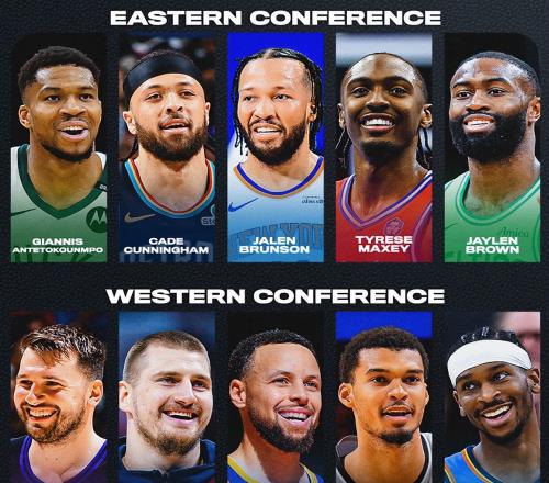 千呼万唤始出来,NBA全明星首发阵容如下:西部:东契奇+约基奇+亚历山大+库里+文班亚马;东部:布伦森+字母哥+马克西+坎宁安+杰伦-布朗。什么?活久见,太不可思议了。联盟大小王竟然同时