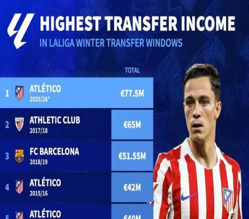 德转列西甲历史冬窗转会收入榜:本赛季马竞7750万欧元第1