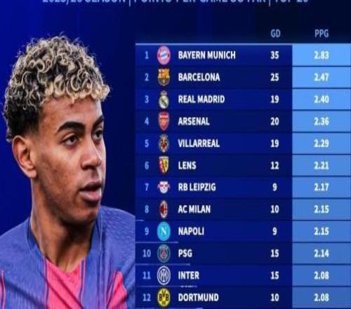 北京时间12月6日,德转统计出了本赛季至今欧洲五大联赛场均积分排名前20的球队,拜仁慕尼黑2.83分高居第一,巴塞罗那2.47分第二,皇家马德里2.40分第三。本赛季至今五大联赛场均积